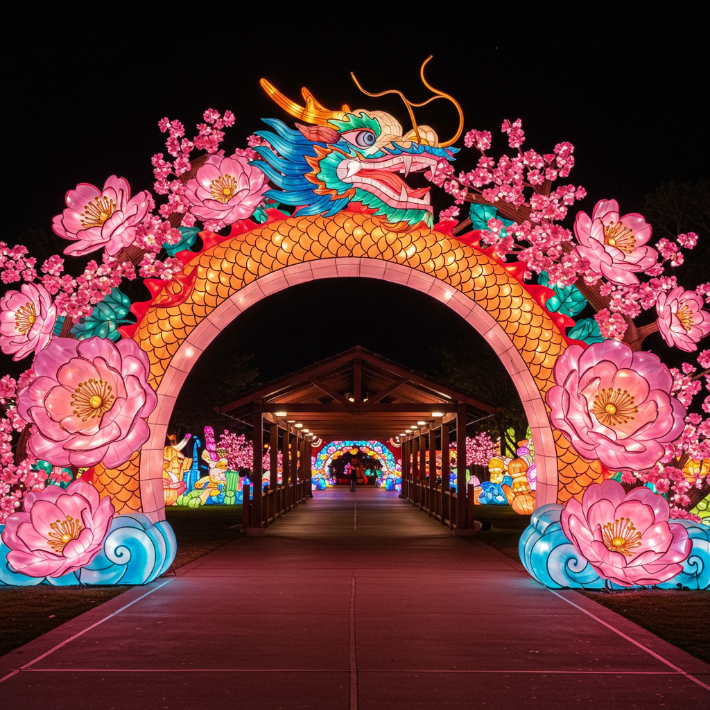 The centerpiece boasts a magnificent 100-foot-long dragon soaring majestically through a cherry blossom forest.