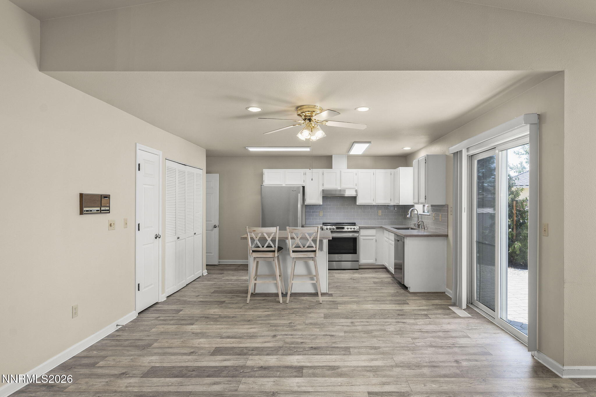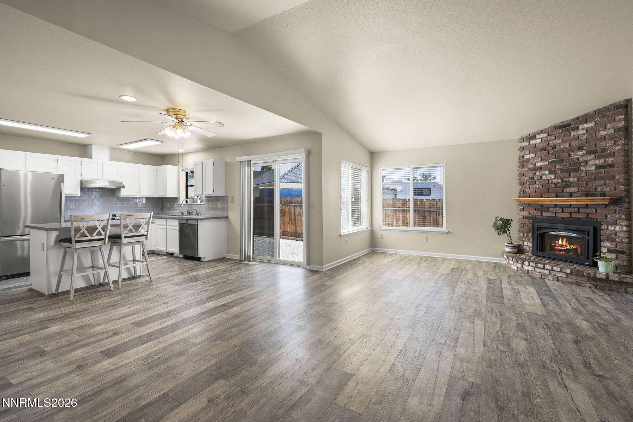Stunning Gardnerville Ranchos home with exceptional upgrades and mountain views. This beautifully maintained single-level residence sits on a spacious quarter-acre corner lot and offers 1,750+- sq ft of thoughtfully designed living space, perfect for both everyday comfort and entertaining. The open great room is anchored by a cozy gas fireplace and flows seamlessly into the updated kitchen, featuring quartz countertops, subway tile backsplash, a large island workspace, pantry, induction range, Bosch dishwasher, refrigerator, and instant hot water faucet. Washer and dryer are included for added convenience. An expansive bonus or recreation room with wet bar and dual sliding glass doors provides flexible space for a home office, media room, gym, or guest retreat with direct access to the backyard. The home offers three well-appointed bedrooms and two updated bathrooms finished with quartz and quality fixtures. Natural light fills the home and highlights peaceful mountain views throughout. Outdoors, enjoy a low-maintenance xeriscaped yard with paver patio, mature fruit trees, RV carport, and a detached two-car garage with both 30-amp and 50-amp hookups, ideal for toys, hobbies, or workshop space. No HOA and ample parking provide added freedom and functionality. This is a rare opportunity to own a move-in ready, upgraded property - combining lifestyle, flexibility, and long-term value. Sellers are building a home out of state and are motivated.